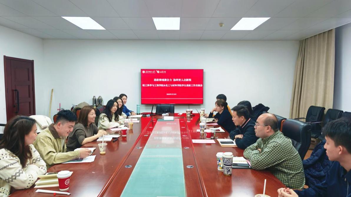 为深入学习贯彻习近平新时代中国特色社会主义思想,全面贯彻落实党的二十大和二十届历次全会精神,深入落实学校“先锋计划”,积极探寻“思政铸魂”行动的基层实践范式,3月16日上午,轻工科学与工程学院学工队伍赴化工与材料学院学习交流。双方围绕新时代学生思想引领的创新路径与协同育人机制的构建展开深度对话。化工与材料学院党委副书记王慧、轻工科学与工程学院党委副书记蒋华朋及两院全体辅导员共同参加本次交流。