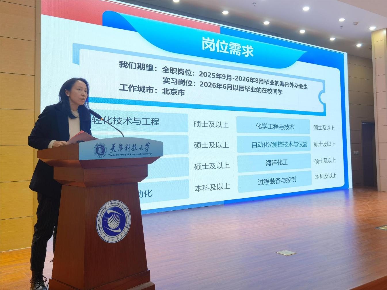 随后,杜雪梅经理详细介绍了招聘需求与福利体系。岗位方面,全职岗位面向2025年9月-2026年8月毕业的海内外毕业生,实习岗位面向2026年6月以后毕业的应届生,岗位设置与天津科技大学的学科专业高度契合。公司有丰厚的薪酬福利与强大的发展保障,还为员工提供一线项目历练机会、全球化发展舞台及清晰的人才晋升路径,全方位助力毕业生成长。