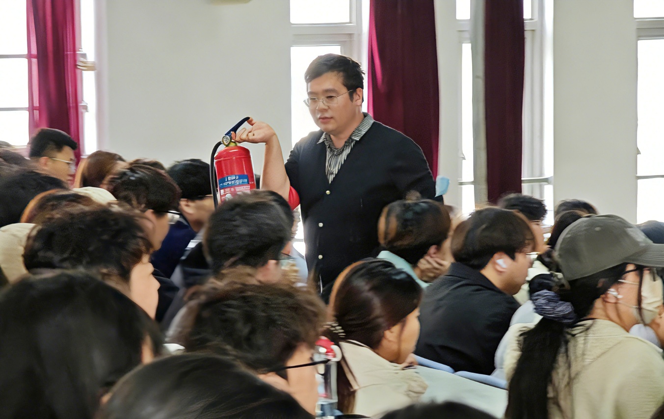 会上,王悦老师围绕宿舍用电安全、消防安全、充电宝规范使用等核心内容展开系统讲解。培训现场,王悦老师手持灭火器实物围绕会场展示,详细讲解灭火器结构与使用步骤,结合干粉灭火器适用场景、注意事项及使用寿命等知识,让同学们直观掌握消防器材操作要领。