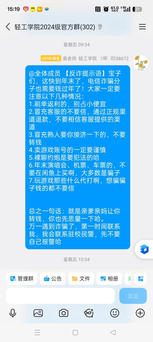 在此基础上,学院聚焦防范电信诈骗中的关键风险点,向学生发出清晰警示:坚决抵制“刷单返利”、“约炮裸聊”等违法诱惑;所有交易务必通过正规平台;对自称客服、熟人借款等情况必须多方核实;不点击不明链接,谨防木马病毒。同时建立快速响应机制,明确要求学生遇到电信诈骗第一时间联系辅导员,学院了解诈骗情况后将快速联动学校保卫处和驻校民警迅速处置。、